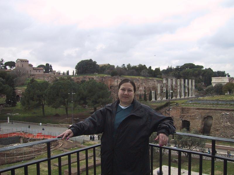 Teri inside the Colosseo with Palatine Hill in background. |