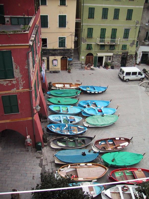 View from "camera con bagno" of Vernazza's harbor square (with cats on
