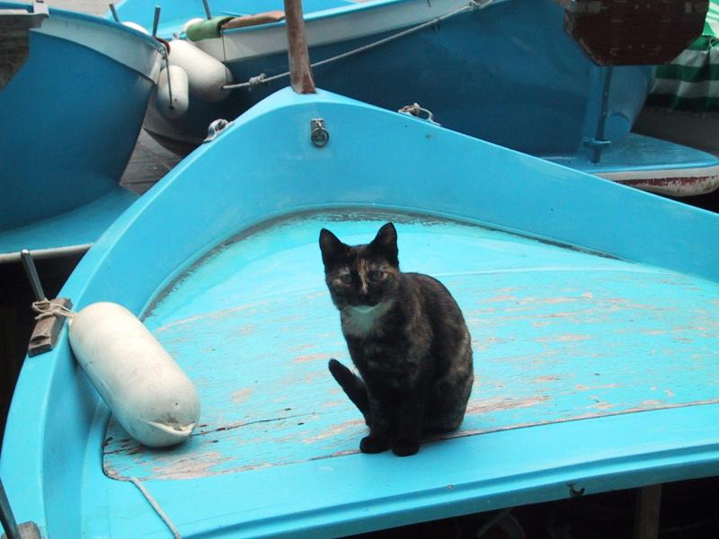 | Cat on fishing boat in Vernazza's harbor square. |