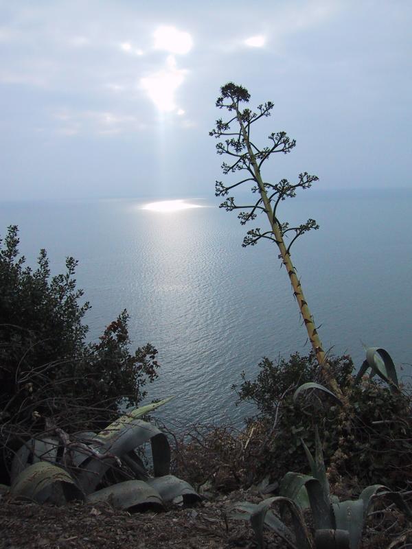 Ancient Yucca and sunlight over Ligurian Sea on hike from Vernazza to