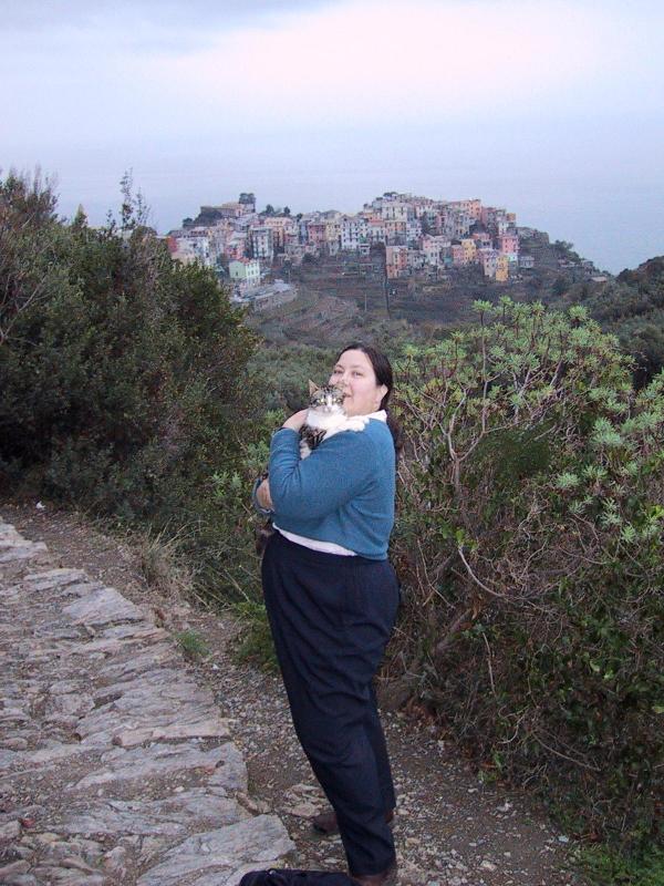 Teri with cat and view of Corniglia on hike from Vernazza. |