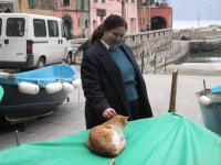 Teri and cat in Vernazza's harbor square. |
