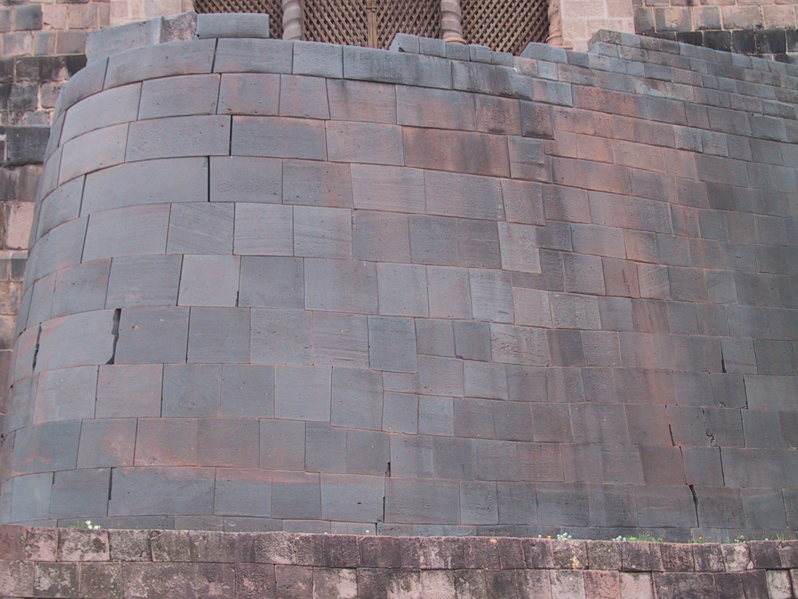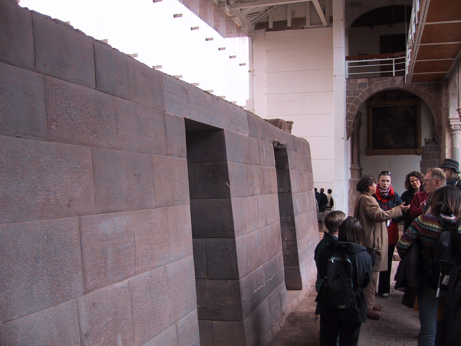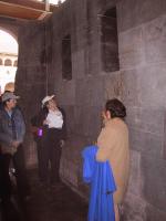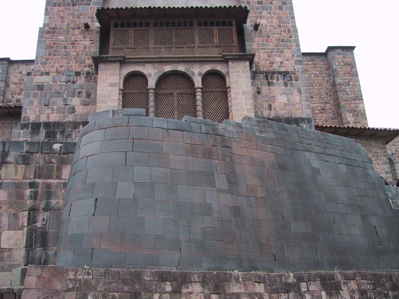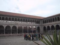 | Teri in Incan temple in Cuzco. This Inca temple was converted into a church by the Spanish. | Colonial courtyard surrounding Incan temple. | Inca temple in Cuzco. | Exterior of Catholic church built on top of the Inca temple to the sun. |