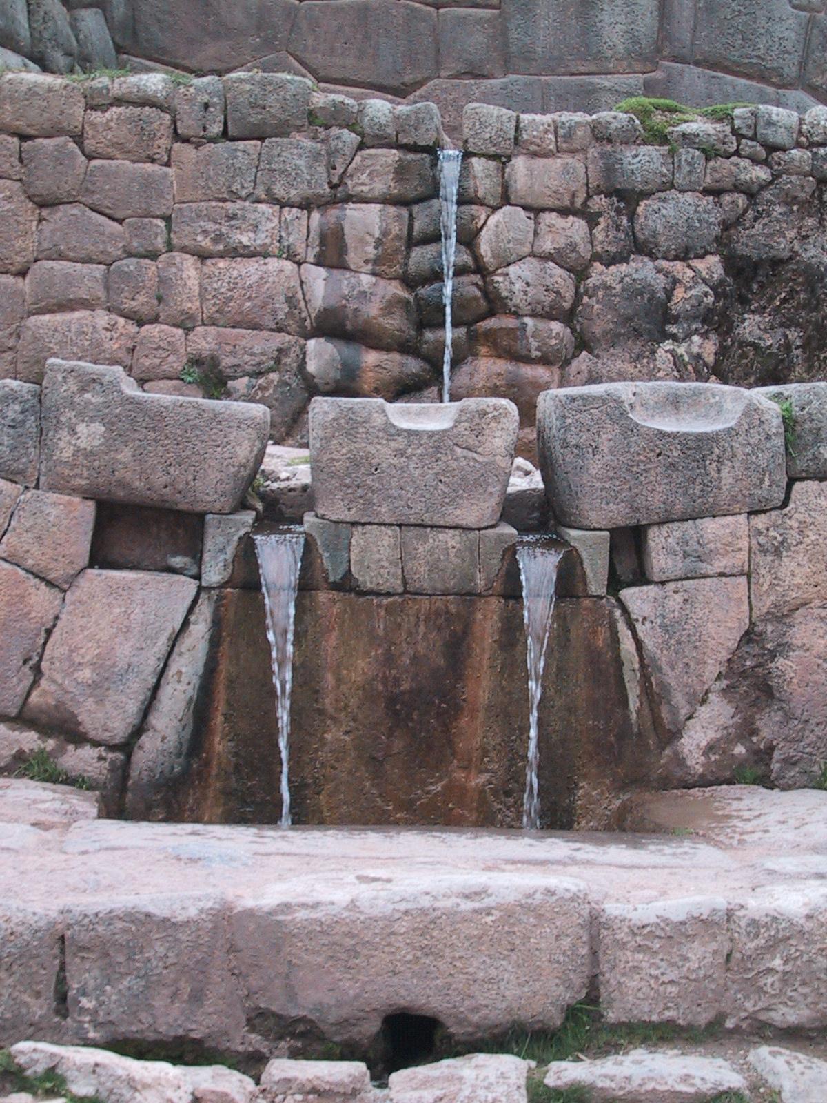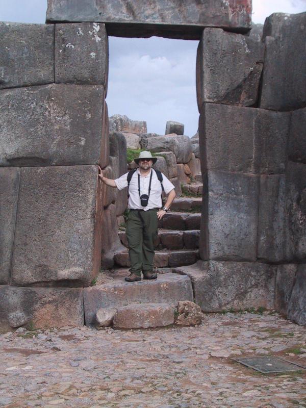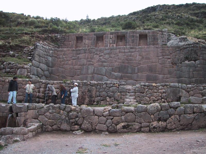 | Randy in doorway at Sacsayhuaman. | Stonework at Sacsayhuaman. | Llamas and Quechua persons at Sacsayhuaman. | Inca sacred fountain. The source of these waters have never been found. The water runs all year round. |