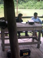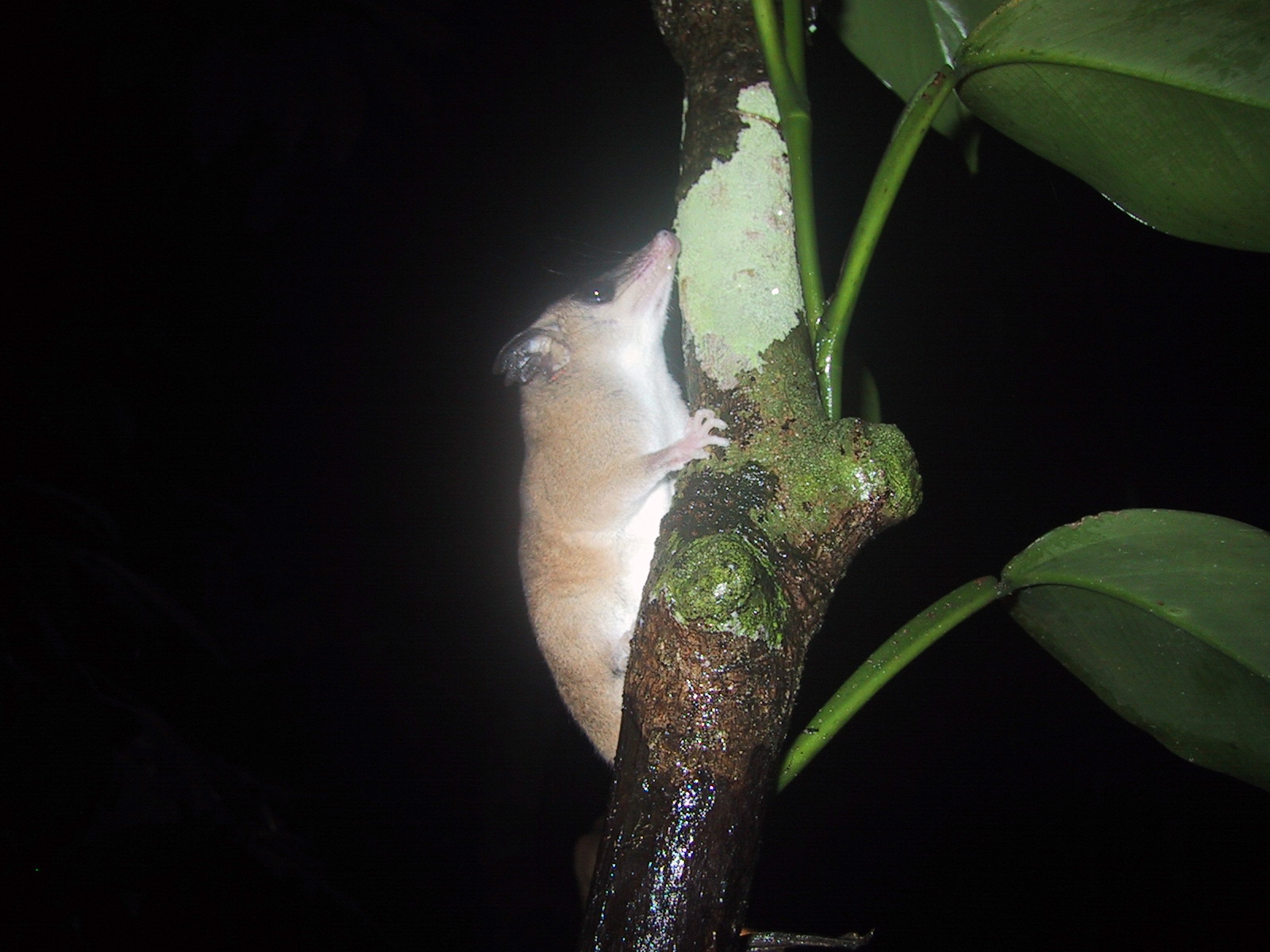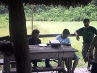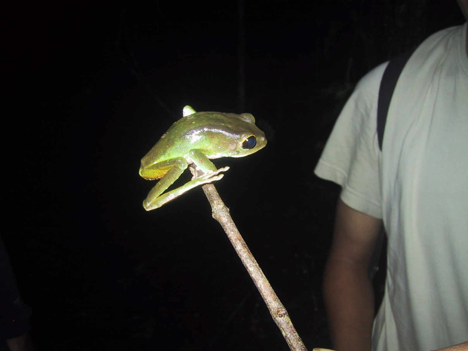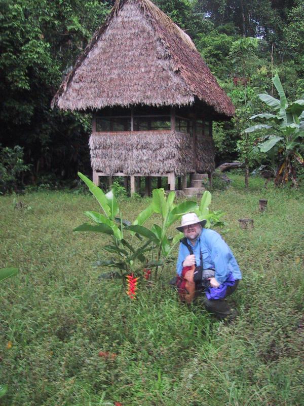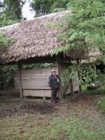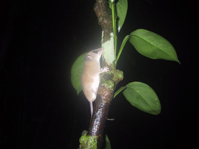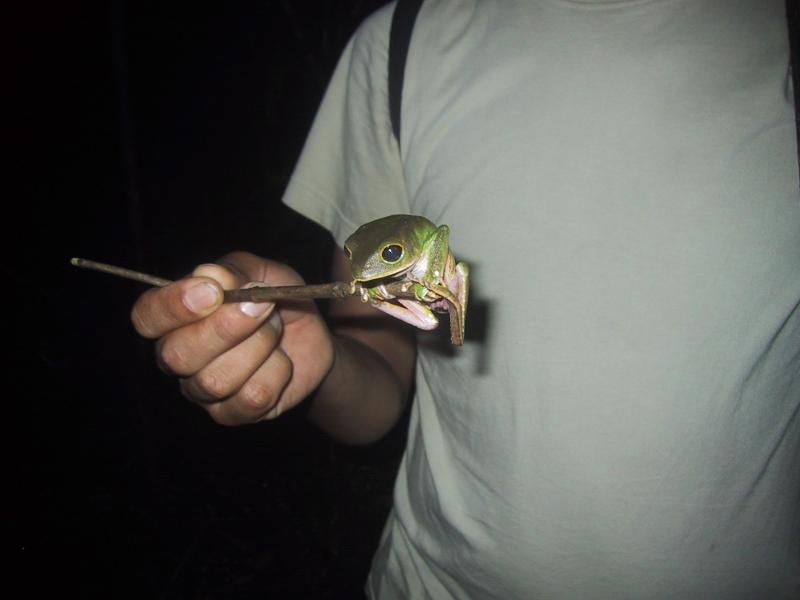 | Opossum mouse during night hike to Tapir lick. | Frog during night hike to Tapir lick. | Juan with Frog during night hike to Tapir lick. | Boca Manu airport (main building) leaving Manu. |
