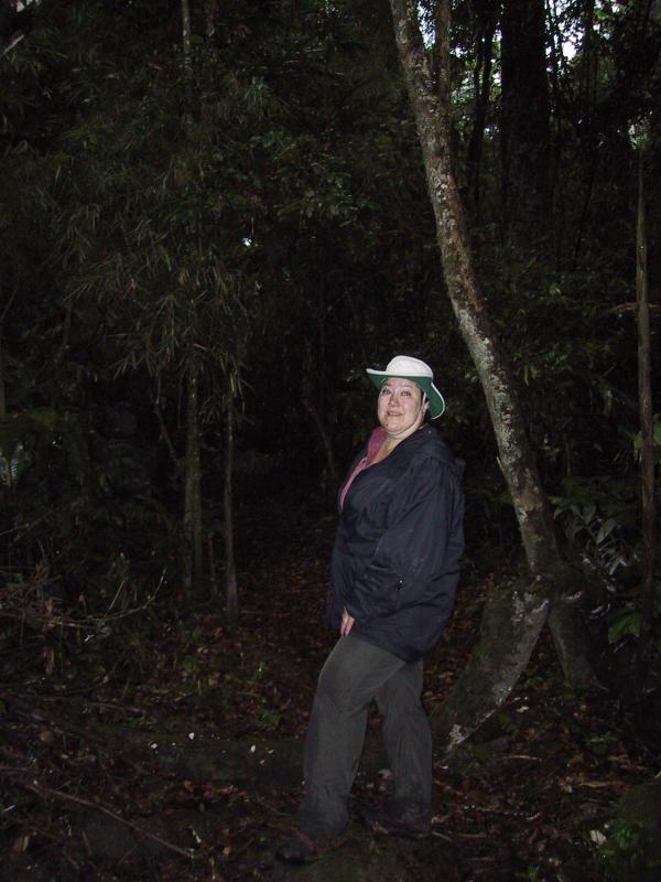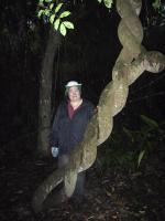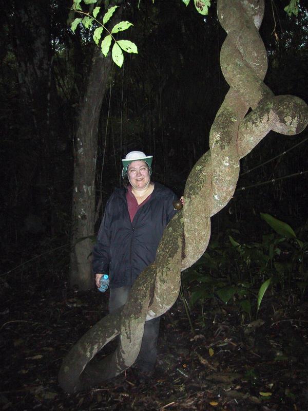 | Teri in the rainforest before a hike to find river otters. | Our guide, Juan, with his new "baby." | Bracken on a log in rain forest. | Bracken on a log in rain forest. |
