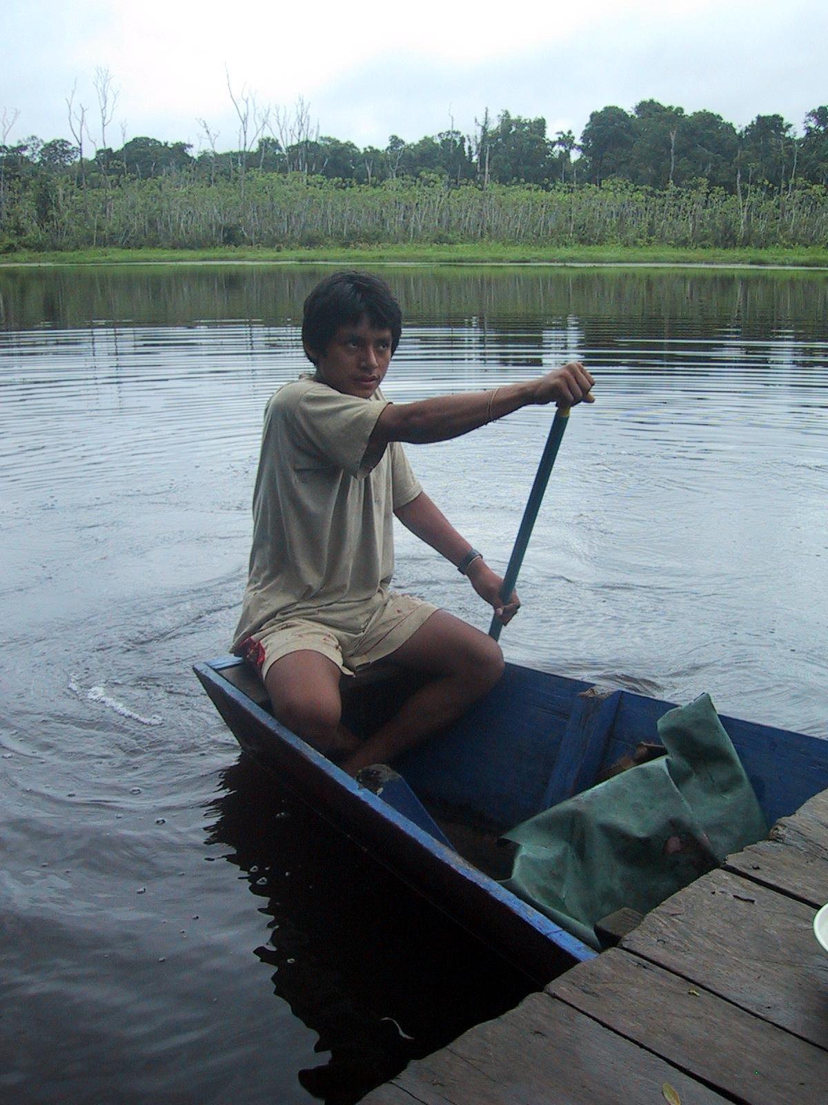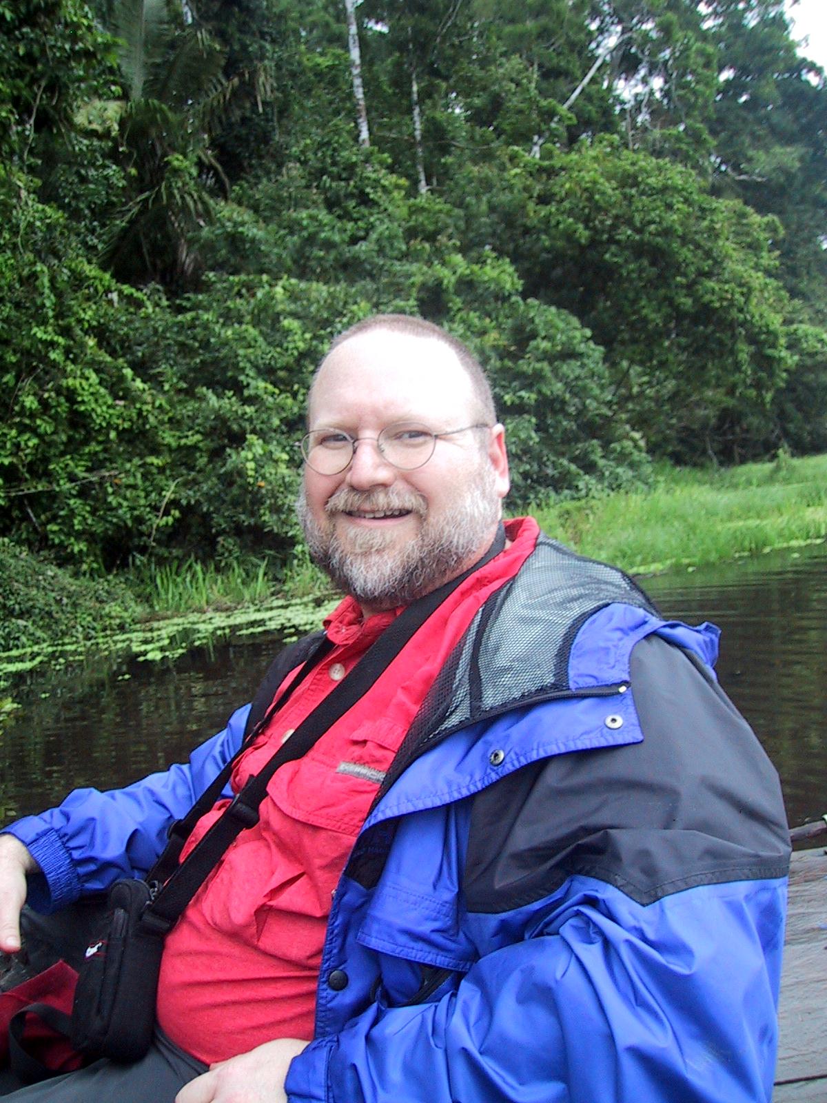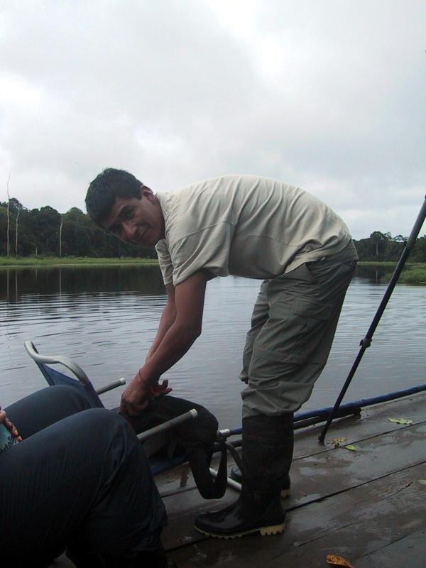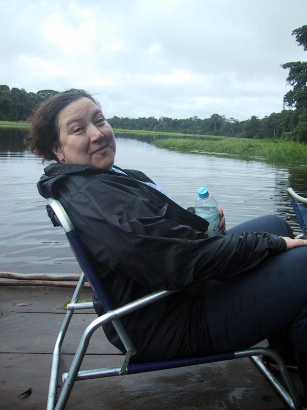 | Teri in the deep dark rain forest. | Teri on catamaran on the oxbow lake. | Randy on catamaran on the oxbow lake. | Our guide, Juan, on catamaran on the oxbow lake. |
