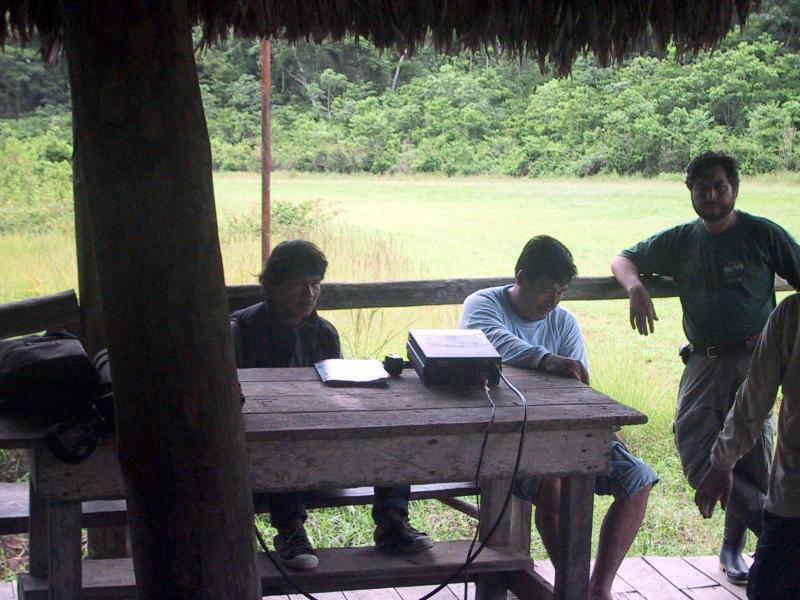 | Communications center at Boca Manu airport. | Communications center at Boca Manu airport. (Notice sophisticated power system.) | Main runway (only runway) at Boca Manu airport. (The pilot complained he won't land there again until it's mowed.) | Small flower (~1cm diam) growing on Boca Manu airport's main runway. |