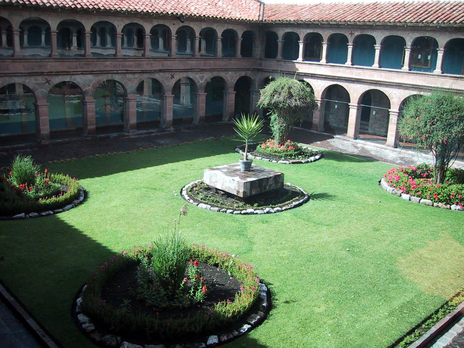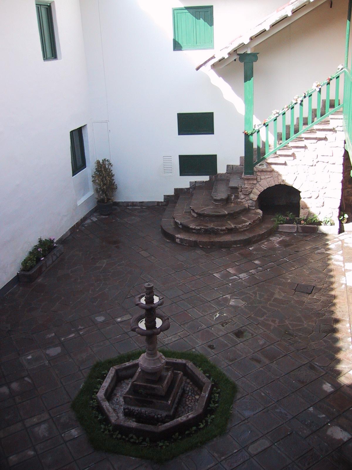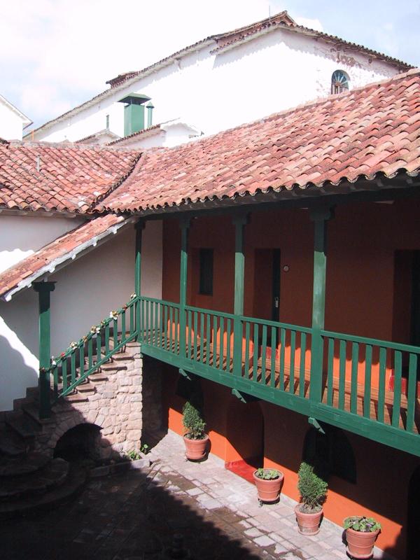 | Courtyard in front of hotel room at Hotel Monestario del Cusco. | Courtyard in front of hotel room at Hotel Monestario del Cusco. | One of the courtyards in Hotel Monestario del Cusco. | Moche (pre-Inca ~100AD-700AD) pottery from the Museum of Pre-Columbian Art in Cuzco. |