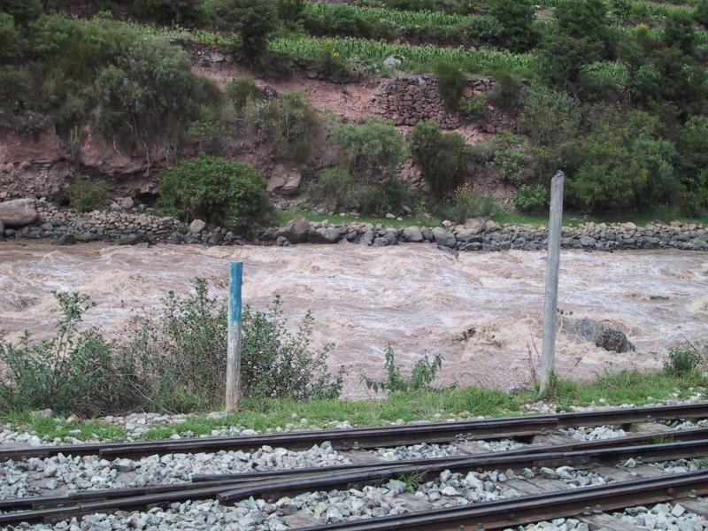 | Moche (pre-Inca ~100AD-700AD) shell bracelet from the Museum of Pre-Columbian Art in Cuzco. | Cuzco city view from Cuzco to Machu Picchu train (on switchbacks). | The Urubamba river from Cuzco to Machu Picchu train. | The agricultural region of Machu Picchu. |