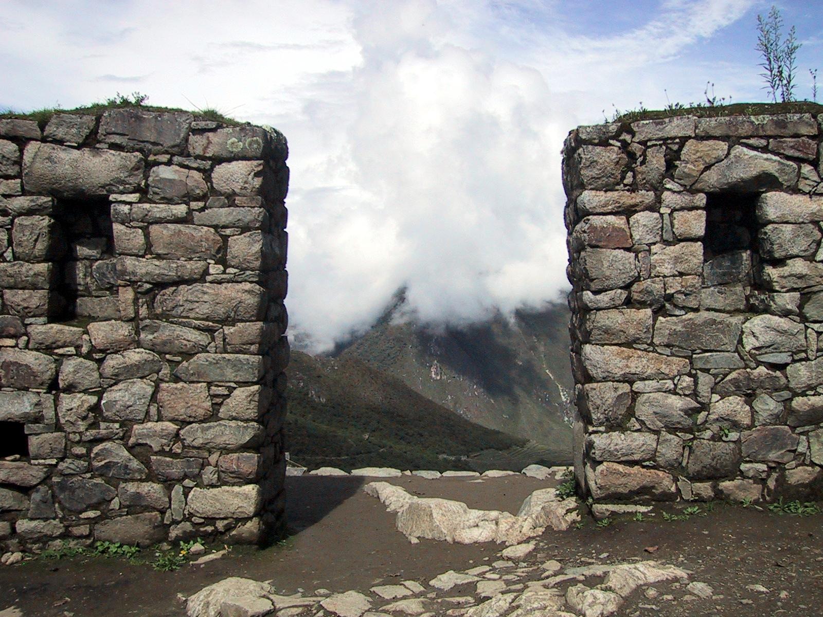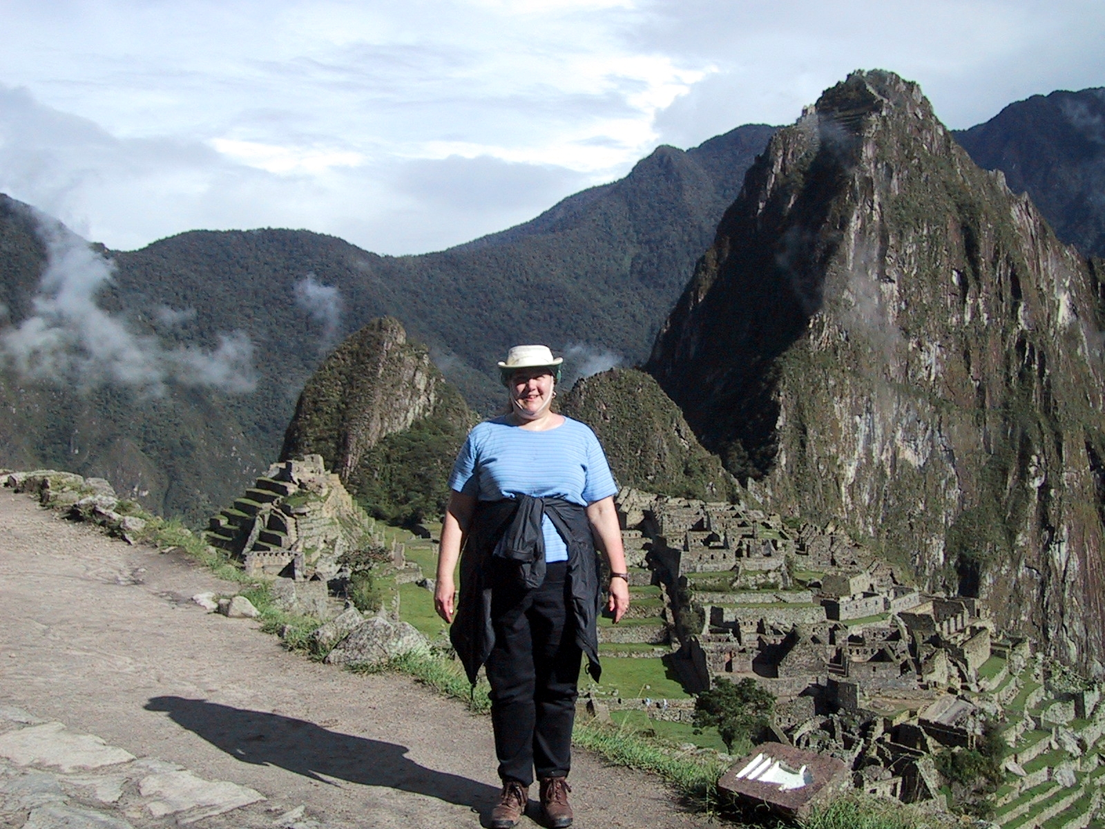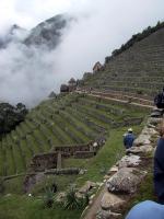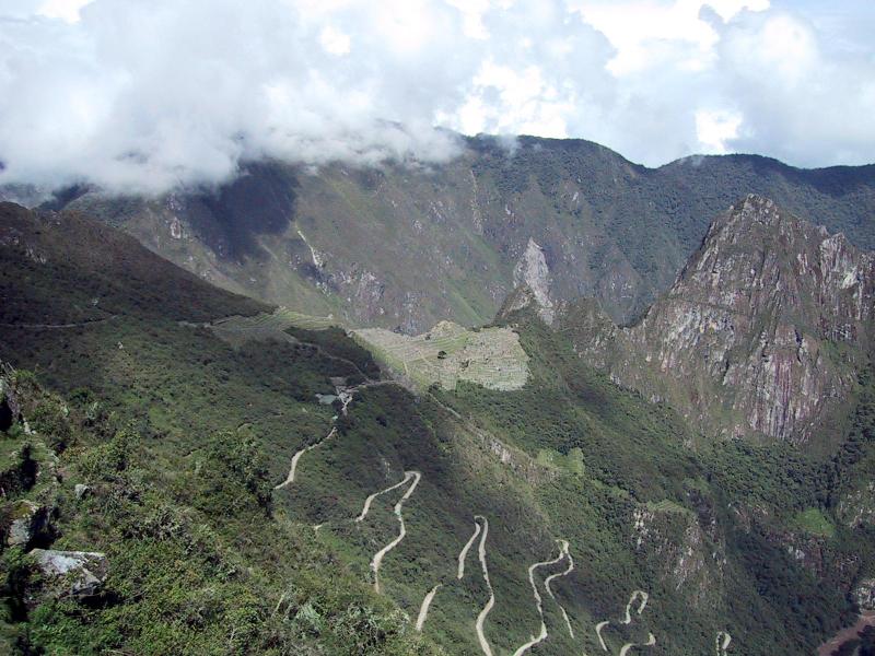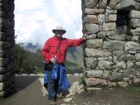 | Randy on the Sun Gate hike at Machu Picchu. | Teri on the Sun Gate hike at Machu Picchu. | View of road upto Machu Picchu from Sun Gate hike. | The Sun Gate. |