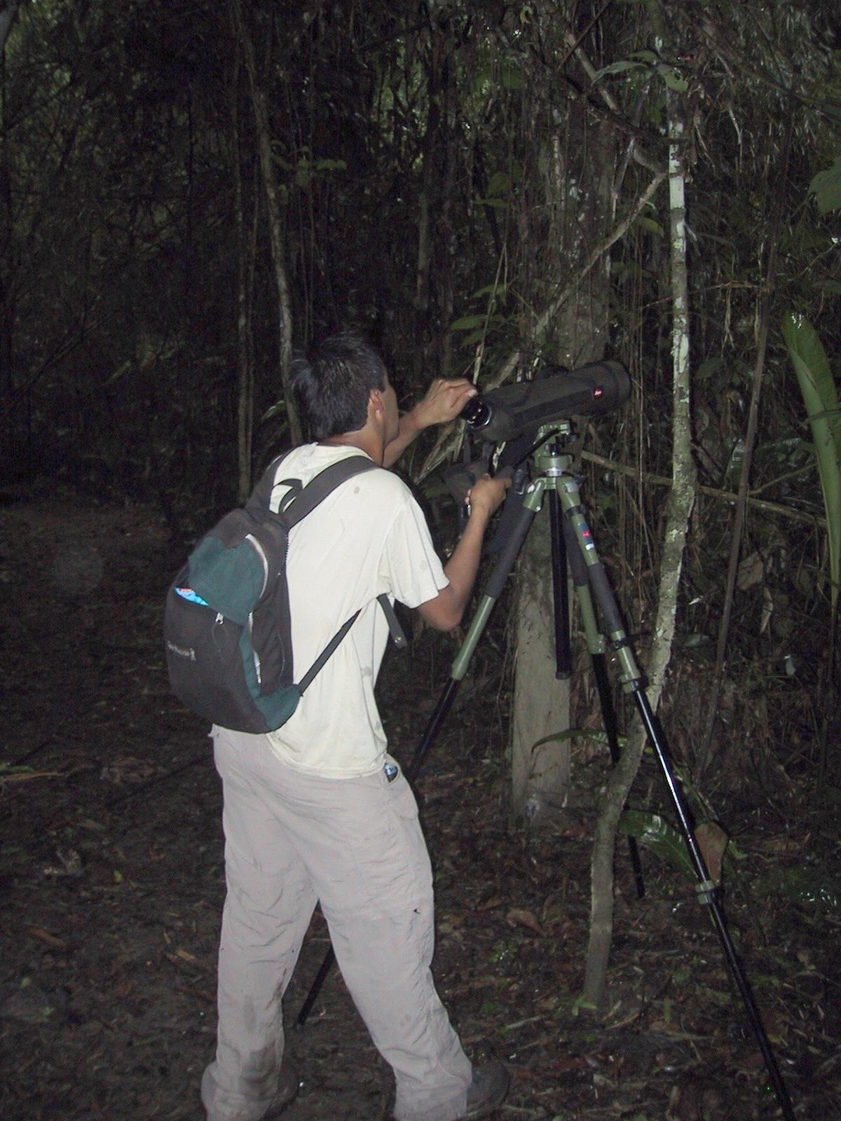 | Cormorant on oxbow lake. | Three-toed sloth (Taken through Juan's spotting scope. I wish I'd thought of that sooner!) | Spider during night hike to Tapir lick. | Opossum mouse during night hike to Tapir lick. (The camera lense is a bit fogged up from the humidity.) |