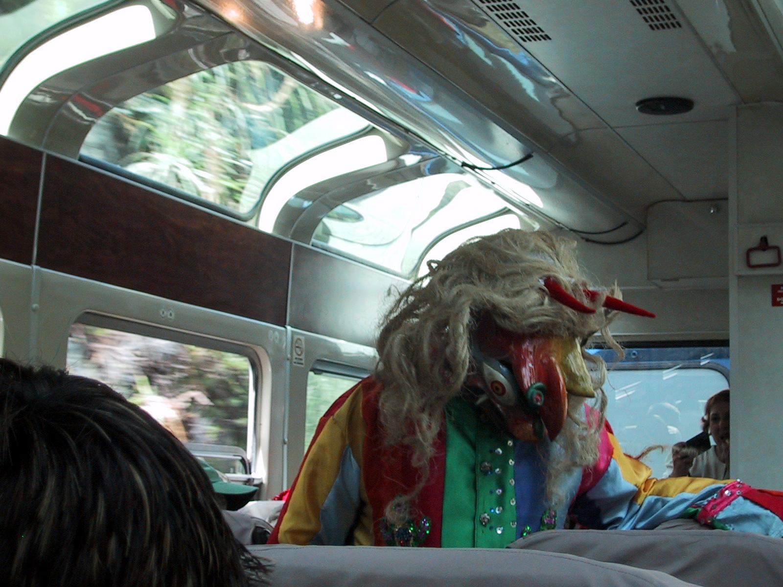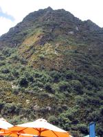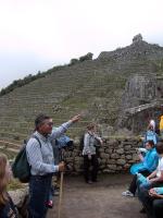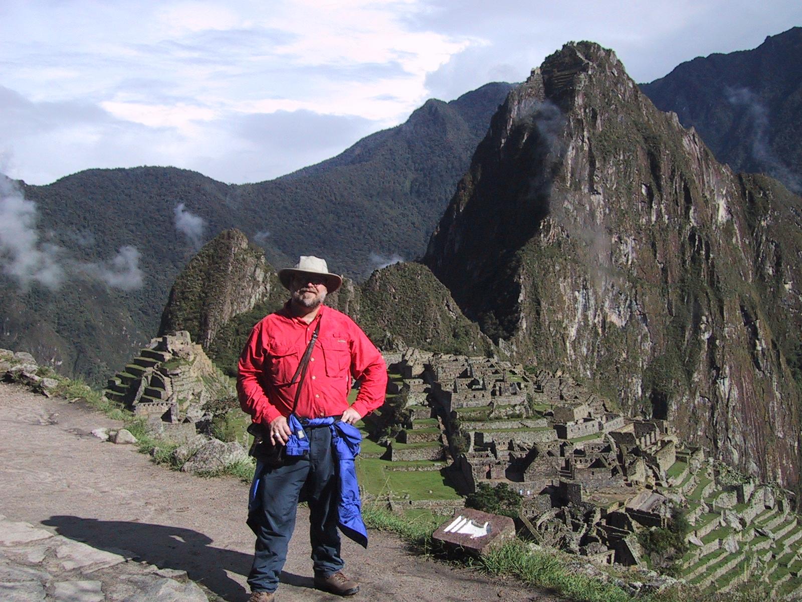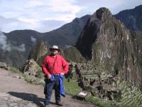| Randy at the Sun Gate. | Bromeliads growing on mountain side near Machu Picchu. | Scary guy on train back from Machu Picchu. | Huaca Pucllana ruins from Lima culture in Lima, Peru. |