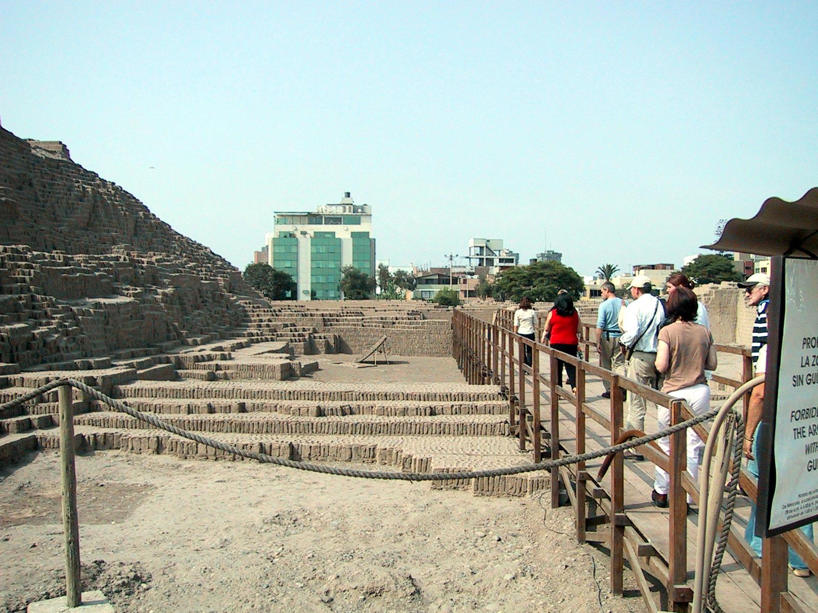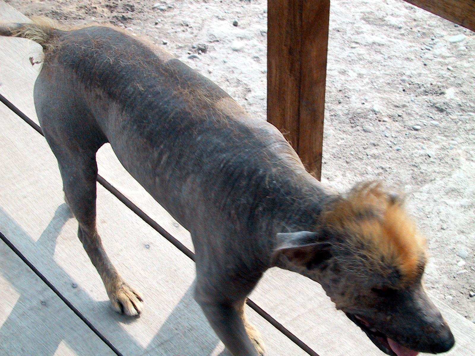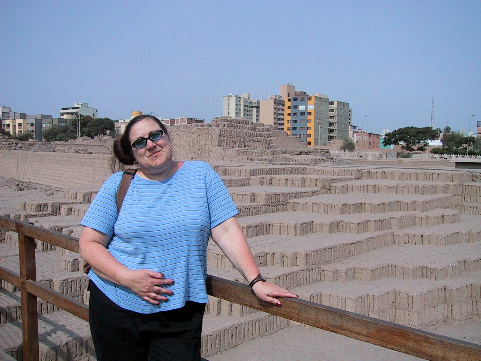 | Teri at Huaca Pucllana ruins. The bricks in this picture were hastily and incorrectly reconstructed. | Huaca Pucllana ruins. | Huaca Pucllana ruins. These bricks are as they were originally constructed. | Peruvian hairless dog at Huaca Pucllana ruins. The Inca used to sleep with these dogs to keep warm, and to cure diseases such as asthma. |